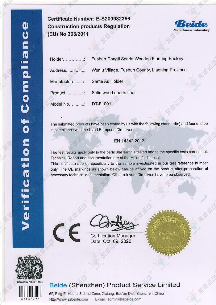 “東體運動”木地板系列產品已經通過國際籃聯檢測、世界羽聯認證、歐盟體育地板專項標準CE認證、歐盟環保產品CE認證、FSC世界森林協會認證、五星級售后服務企業認證等,是中國職業籃球俱樂部遼寧沈陽三生飛豹籃球俱樂部官方合作伙伴,內蒙古籃球協會戰略合作伙伴。